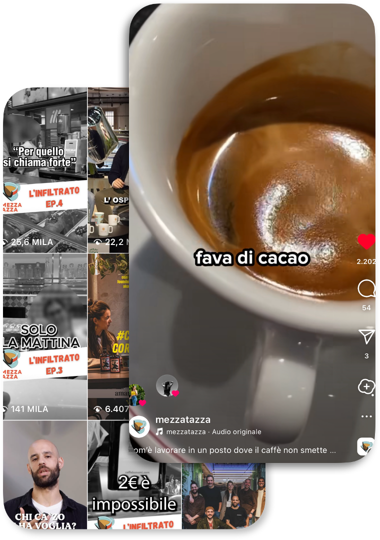 IL PUNTO DI RIFERIMENTO DEL CAFFÈ NEL MONDO Ci occupiamo di content creation, social media management, art direction e brand partnership. +4,6% FOLLOWERS+465K VIEWS+3K INTERACTIONS @mezzatazza ogni mese in organico ogni mese ogni mese